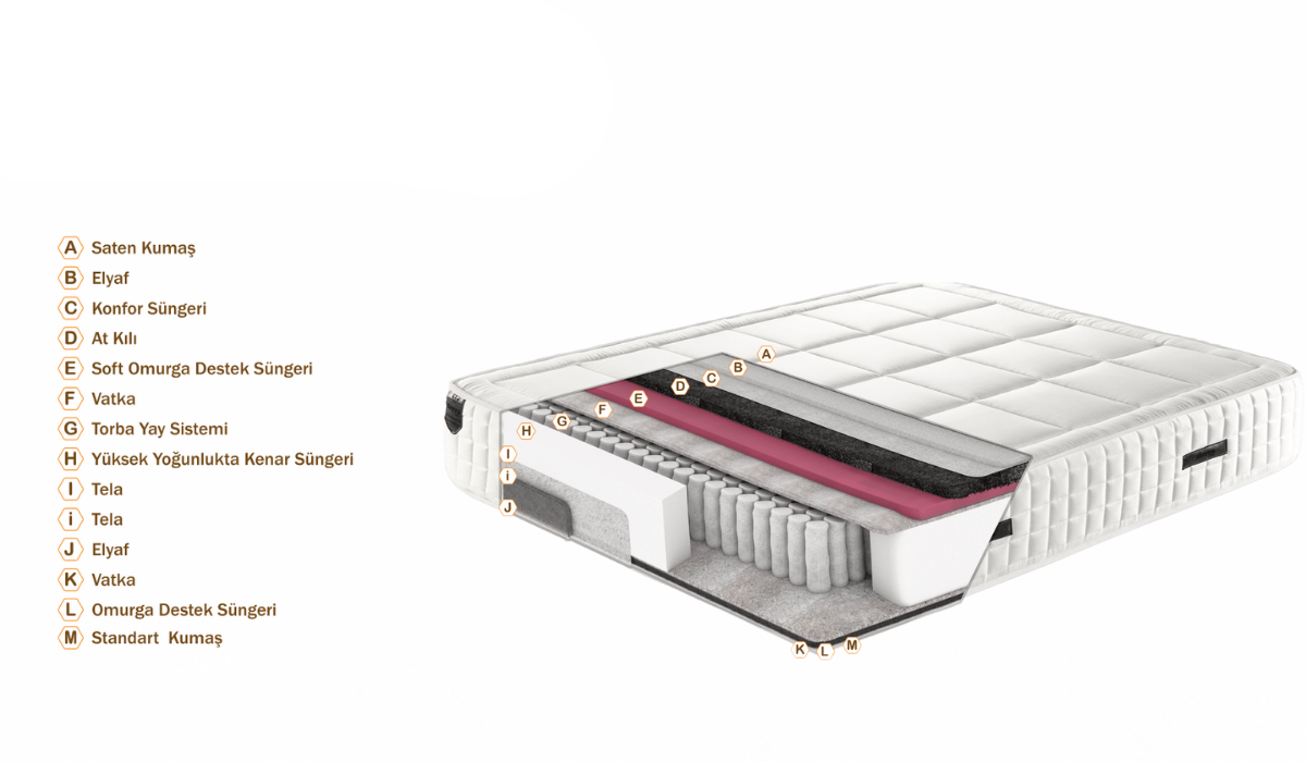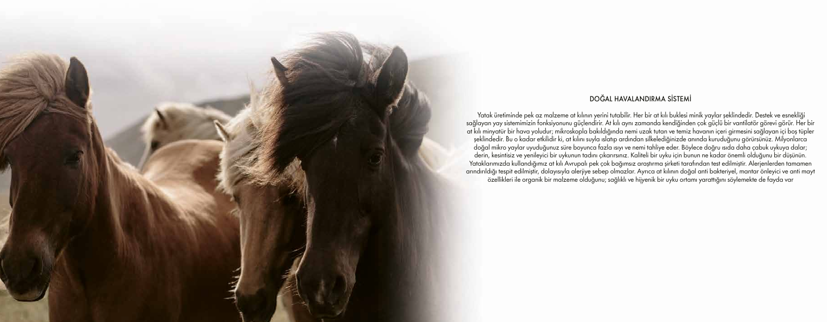 Yatak üretiminde pek az malzeme at kılının yerini tutabilir. Her bir at kılı buklesi minik yaylar şeklindedir. Destek ve esnekliği sağlayan yay sistemimizin fonksiyonunu güçlendirir.At kılı aynı zamanda kendiğinden çok güçlü bir vantilatör görevi görür. Her bir at kılı minyatür bir hava yoludur; mikroskopla bakıldığında nemi uzak tutan ve temiz havanın içeri girmesini sağlayan içi boş tüpler şeklindedir. Bu o kadar etkilidir ki, at kılını suyla ıslatıp ardından silkelediğinizde anında kuruduğunu görürsünüz. Milyonlarca doğal mikro yaylar uyuduğunuz süre boyunca fazla ısıyı ve nemi tahliye eder. Böylece doğru ısıda daha çabuk uykuya dalar; derin, kesintisiz ve yenileyici bir uykunun tadını çıkarırsınız. Kaliteli bir uyku için bunun ne kadar önemli olduğunu bir düşünün.