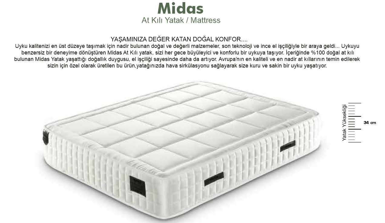 Uyku kalitenizi en üst düzeye taşımak için nadir bulunan doğal ve değerli malzemeler, son teknoloji ve ince el işçiliğiyle bir araya geldi.Uykuyu benzersiz bir deneyime dönüştüren MidasAt Kılı yatak, sizi her gece büyüleyici ve konforlu bir uykuya taşıyor. İçeriğinde %100 doğal at kılı bulunan Midas Yatak yaşattığı doğallık duygusu, el işçiliği sayesinde daha da artıyor. Avrupa’nın en kaliteli ve en nadir at kıllarının temin edilerek sizin için özel olarak üretilen bu ürün,yatağınızda hava sirkülasyonu sağlayarak size kuru ve sakin bir uyku yaşatacak.
