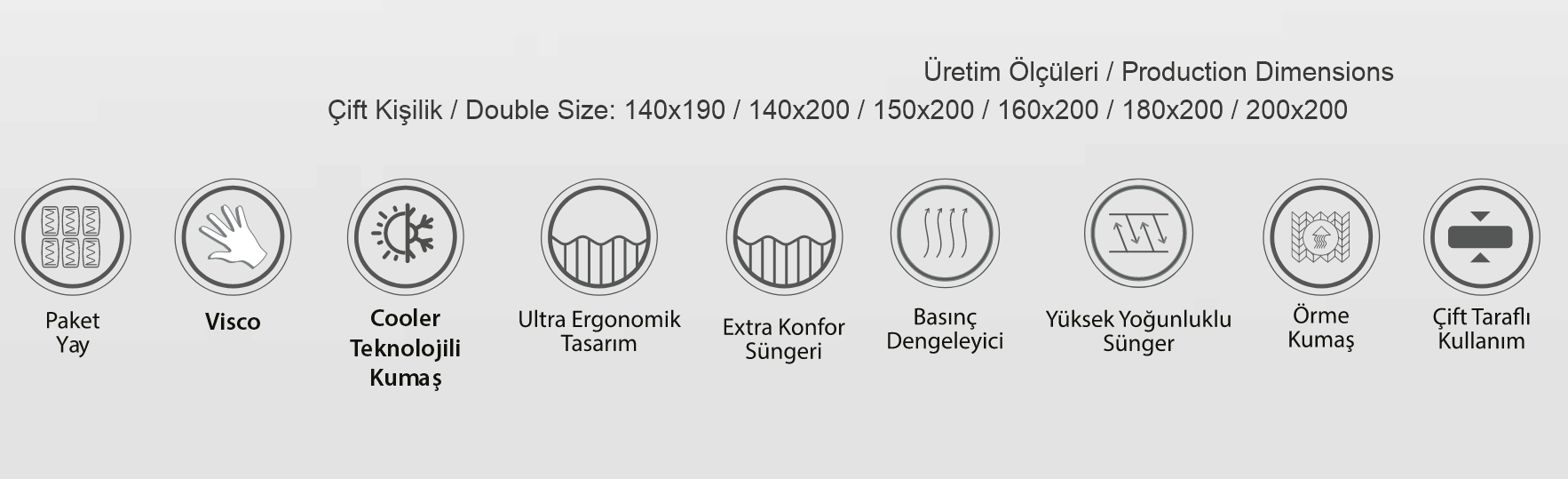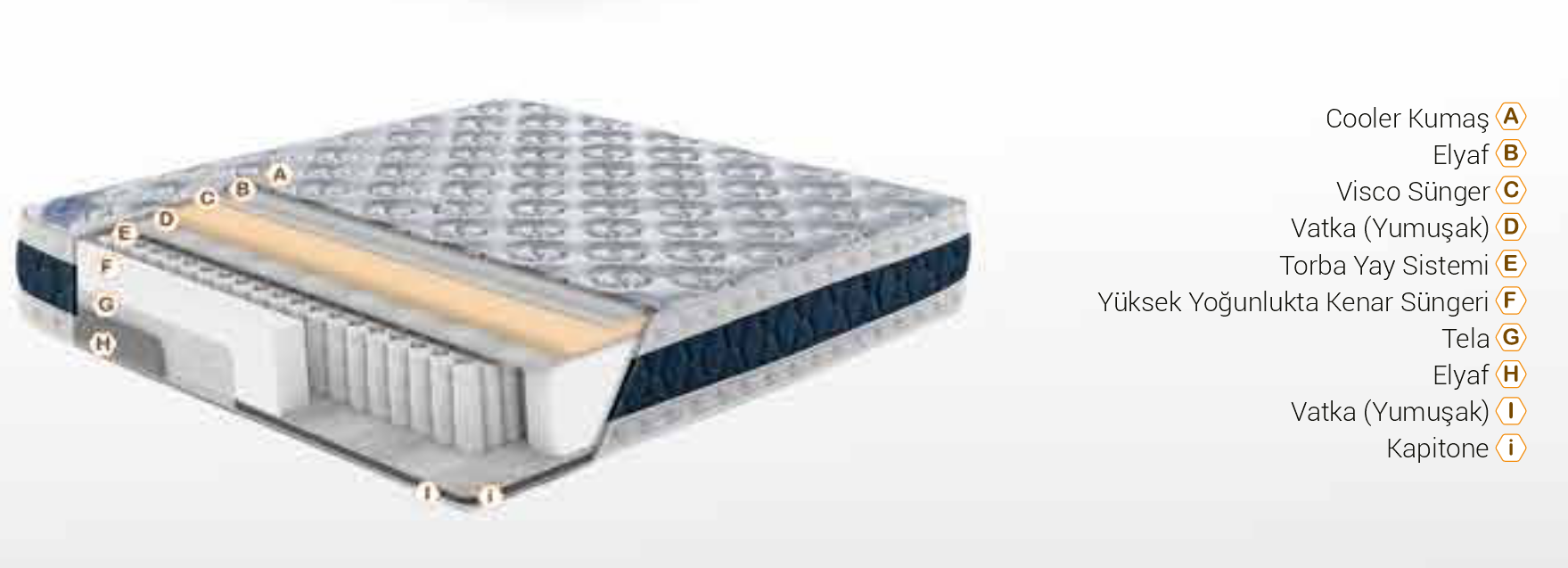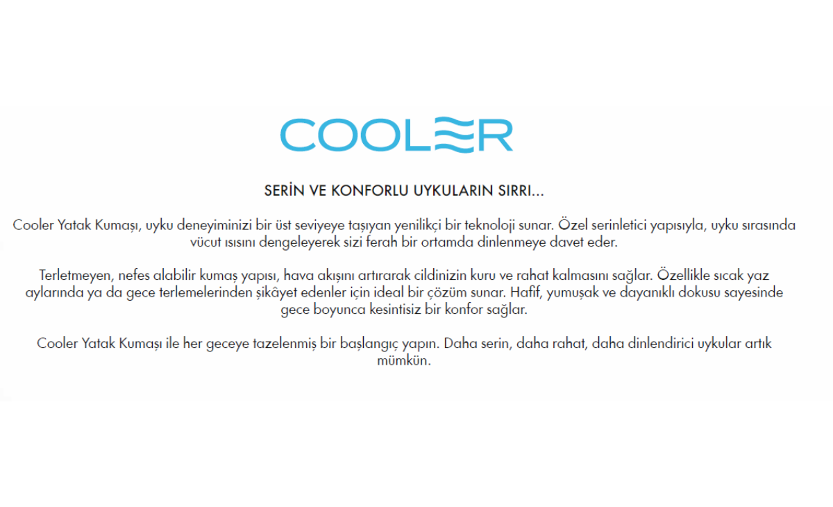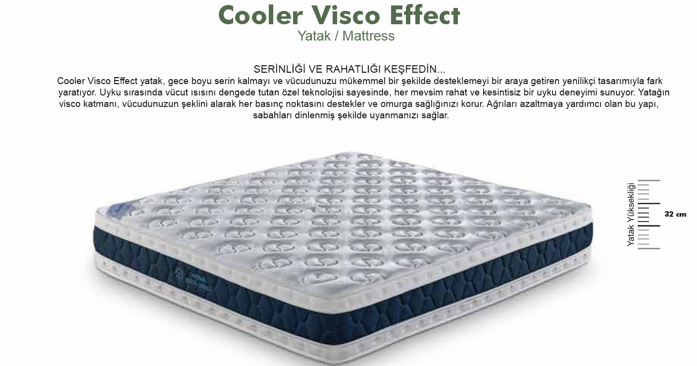 Cooler Visco Effect Yatak, özel visco sünger teknolojisi ile vücut ağırlığını dengeli şekilde dağıtarak basıncı azaltır ve mükemmel bir uyku deneyimi sunar. Serinletici etkisi sayesinde uyku sırasında ideal sıcaklık dengesini koruyarak ferah bir his sağlar. Ergonomik yapısı omurgayı destekler ve doğru uyku pozisyonunu teşvik eder. Nefes alabilen kumaşı sayesinde hijyenik ve sağlıklı bir kullanım sunan Cooler Visco Effect Yatak, kaliteli ve rahat bir uyku arayanlar için mükemmel bir seçimdir.
