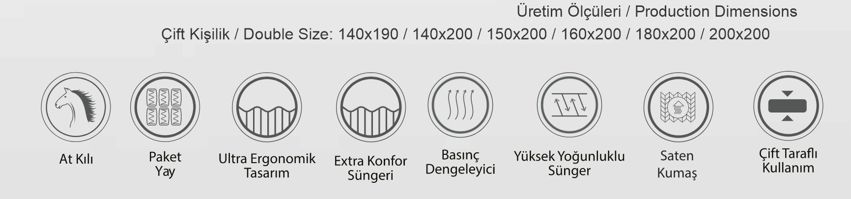 Yatak üretiminde pek az malzeme at kılının yerini tutabilir. Her bir at kılı buklesi minik yaylar şeklindedir. Destek ve esnekliği sağlayan yay sistemimizin fonksiyonunu güçlendirir.At kılı aynı zamanda kendiğinden çok güçlü bir vantilatör görevi görür. Her bir at kılı minyatür bir hava yoludur; mikroskopla bakıldığında nemi uzak tutan ve temiz havanın içeri girmesini sağlayan içi boş tüpler şeklindedir. Bu o kadar etkilidir ki, at kılını suyla ıslatıp ardından silkelediğinizde anında kuruduğunu görürsünüz. Milyonlarca doğal mikro yaylar uyuduğunuz süre boyunca fazla ısıyı ve nemi tahliye eder. Böylece doğru ısıda daha çabuk uykuya dalar; derin, kesintisiz ve yenileyici bir uykunun tadını çıkarırsınız. Kaliteli bir uyku için bunun ne kadar önemli olduğunu bir düşünün.